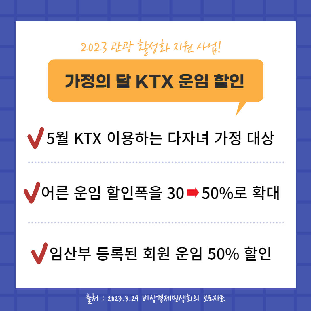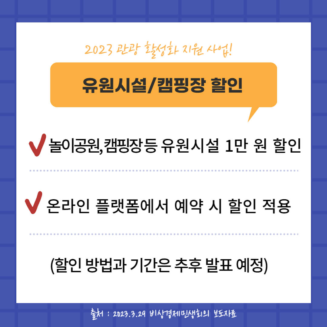 해당 내용은 지난 3월 29일 비상 경제 민생회의 보도자료 내용을 참조했습니다. 고물가, 고금리로 힘든 요즘 이 같은 지원정책이 얼마나 도움이 될지 체감되지 않지만 많은 분들이 혜택 보고 가족과 더욱 행복하고 좋은 추억 만드는 계기가 되었으면 합니다.