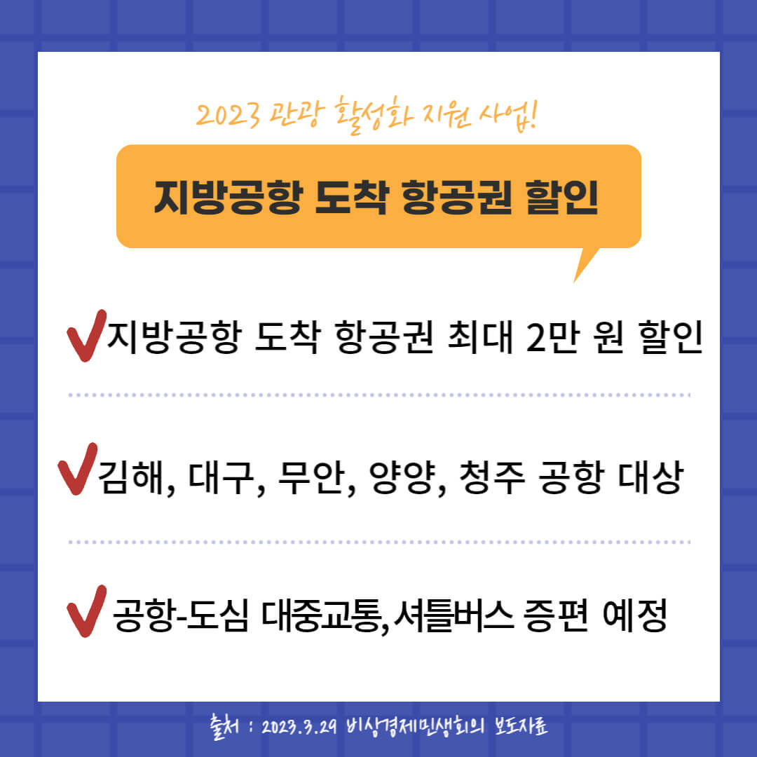 김해, 대구, 무안, 양양, 청주 공항 도착 항공권에 최대 2만 원 할인해 줍니다. 또한 여행 편의를 위해 공항에서 도심으로 이어지는 대중교통과 셔틀버스도 증편 예정입니다.