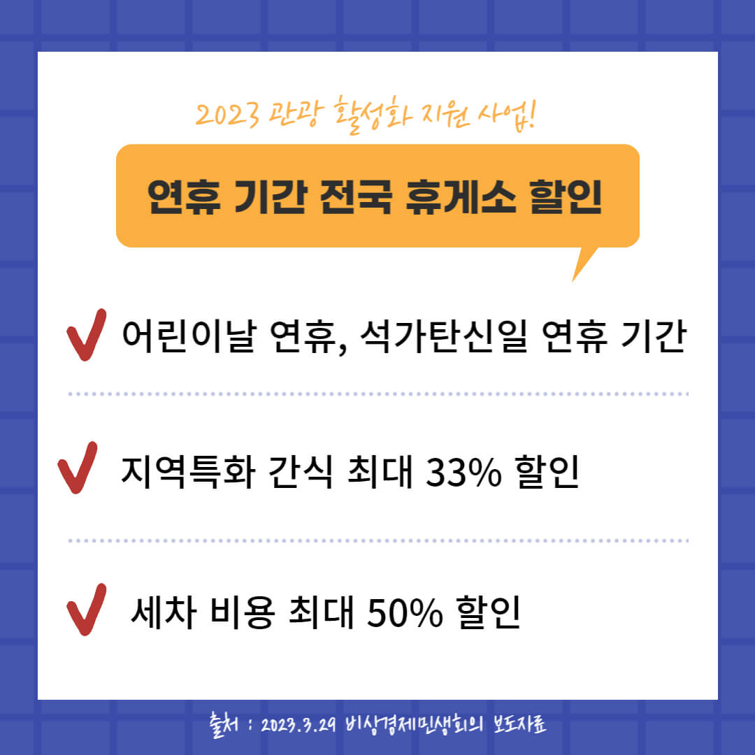 고물가, 고금리로 서민 경제가 심하게 타격을 받고 있죠. 저 역시 자꾸 고공행진 하는 물가 때문에 요즘 장보기가 무서울 정도입니다. 정부에서도 이를 의식했는지 내수 활성화 대책을 내놓았습니다. 눈에 띄는 것은 관광 활성화 지원사업으로 가정의 달 5월부터 지원받을 수 있는 혜택을 정리해 보았습니다.