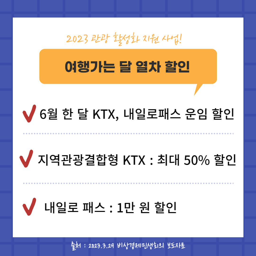 여름 성수기를 한 달 앞둔 6월을 여행 가는 달로 지정하여 열차 할인 혜택을 줍니다. 기차 자유여행 패스인 '내일로' 패스 1만 원 할인과 KTX 최대 50% 할인해 줍니다.